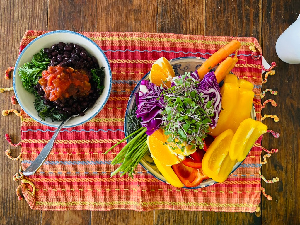 So, after years of eating a whole food plant based diet, I thought I’d share what a typical lunch looks like. I tend to run or workout before a late lunch so it is the largest meal in volume but perhaps not in calories (though there are plenty). I aim to get as many raw vegetables of as many varieties and colors as I can. Before rinsing and throwing everything into my salad bowl I had a handful of strawberries that were sitting on the counter and ate a few handfuls of baby arugula because it would not fit. In the bowl you’ll see some sprouts (a mix), carrots, red cabbage, broccolini, a red and yellow pepper, and an heirloom navel orange. By the end of this meal I will have had 10-12 servings of veggies and about 7-8 servings of fruit (including what I had at breakfast). This way, anything at dinner is a bonus!